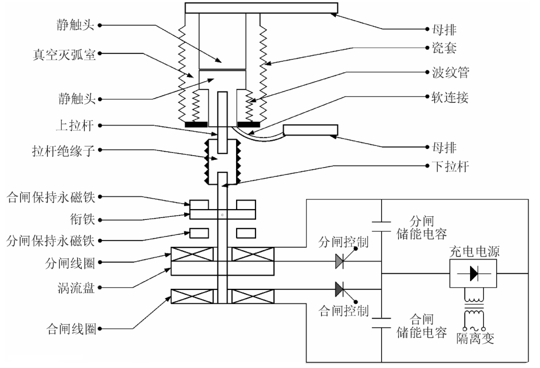 如下图,为VFC开关电磁斥力机构和电路原理示意图。